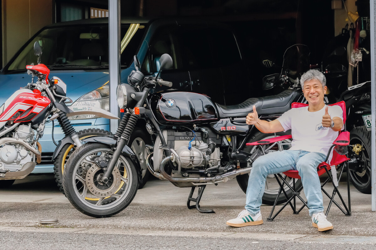 多忙な日々を送る千葉裕治さんのバイクライフを支えるのが、クルマも収まる広々とした自宅ガレージ。セロー、R80、R1200R、ハンターカブの4台が格納され、メンテナンスやキャンプギアの収納にも最適です。趣味が詰まった「男の作業場」をご紹介します