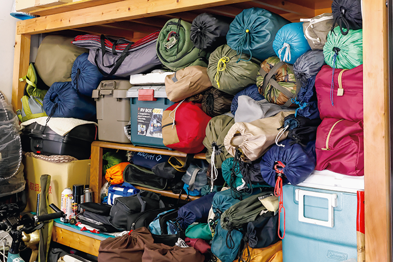 よくキャンプツーリングにも出かけるという千葉さん。ガレージ内の棚にはキャンプ用品もズラリと収納されている。濡れたり汚れたテント類をすぐに干すことができるのも便利