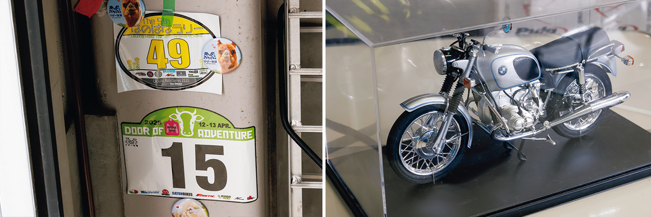 ガレージ内には工具やバイク用品のほか、バイクのミニチュアモデルがいくつも置かれている。またラリーに参加したときのゼッケンなどもあしらわれ、ガレージらしさを表現していた