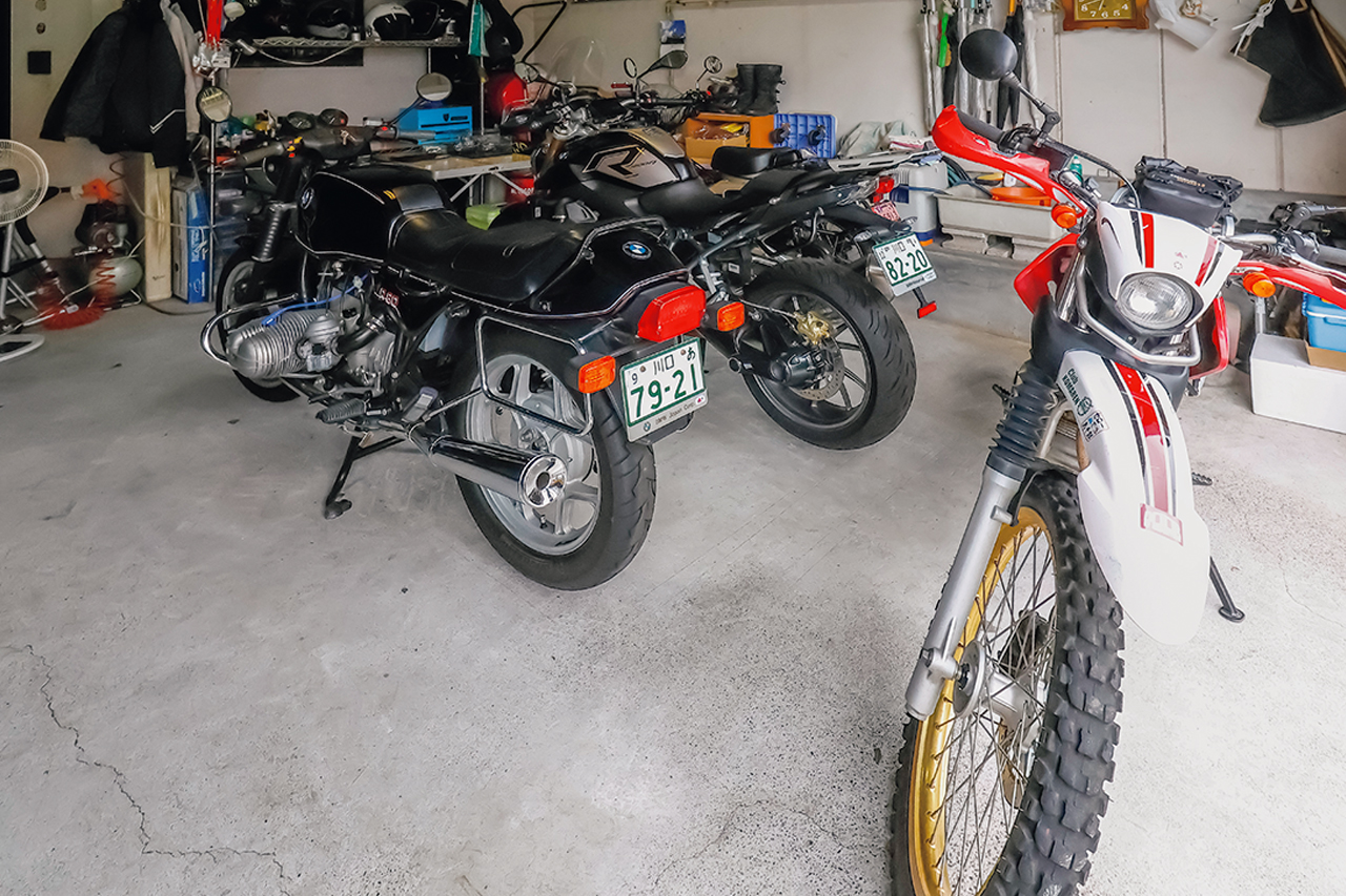 そのバイクライフに欠かせないのが、自宅に構えた十分なスペースが確保されたガレージスペースだ。そこには、近年出動率が高いセロー250のほかにBMW R80、R1200R、そしてホンダCT125・ハンターカブの計4台が納められている。クルマの駐車スペースも確保されていて、実に広々としたスペースだ。