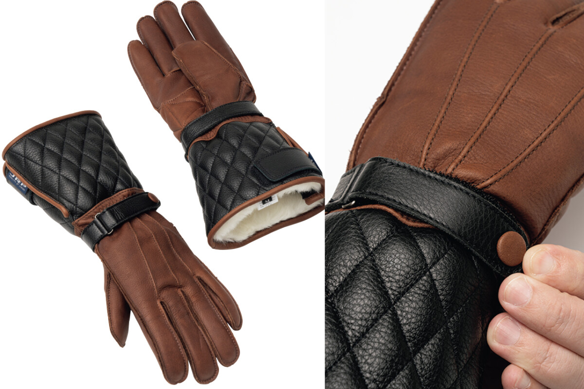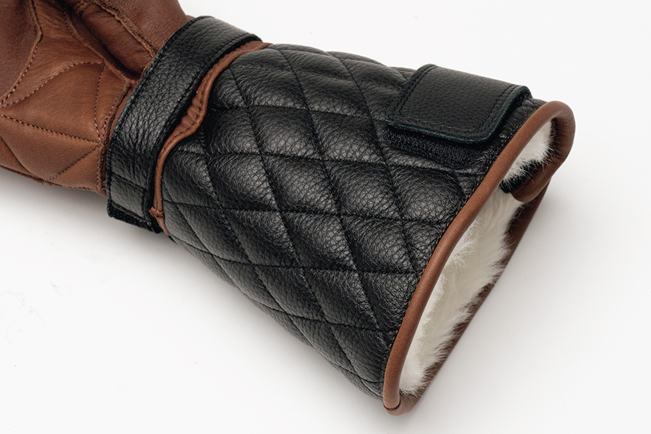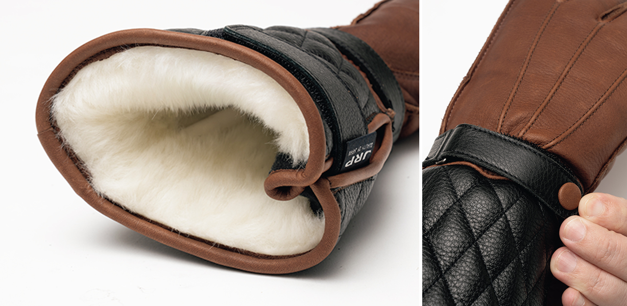 手首から上には耐水加工牛革、下にはオイル入り牛革と2種類の素材を採用。操作性と防寒性の両方を追求した構造だ
