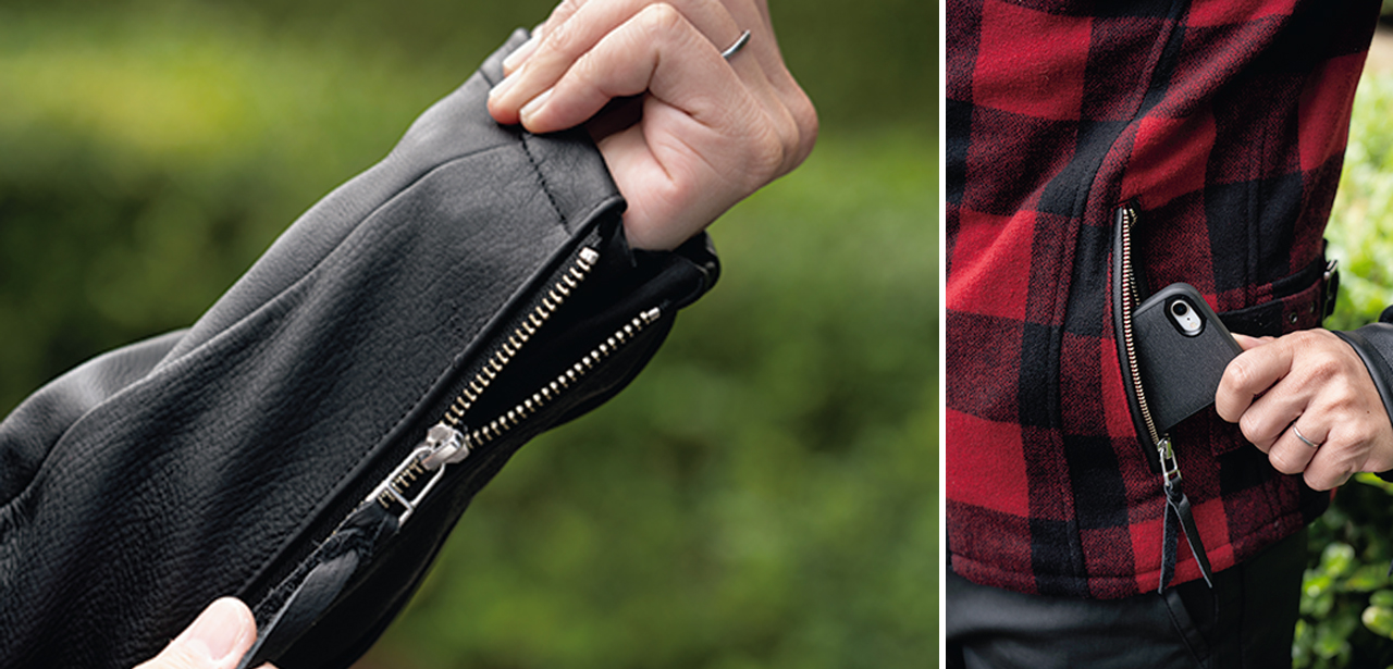 タンクなどへ干渉しにくい革の半玉縁ファスナーを採用。袖口にもファスナーを配置しているので脱ぎ着しやすい