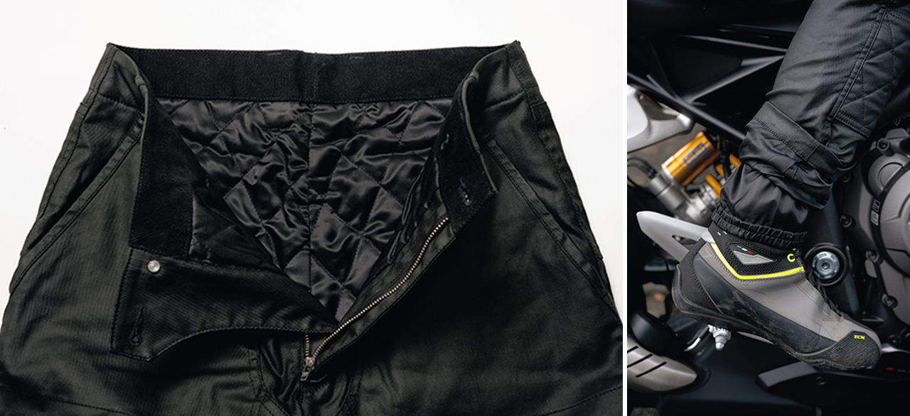 「WKラバーコートウォームパンツ」は、ストレッチコットンにPUラバーコーティングを施した表地が特徴で、レザーライクな質感と軽さを両取りするパンツ。こちらもジャケット同様の4重構造を採用し、裾内側のウィンドシャッターが足元からの冷気侵入を遮断する。膝には別売プロテクターを装着可能となっていて、ブラック一色のシンプルなルックスはあらゆるコーディネートスタイルに自然に馴染む。防寒セットアップの組み合わせで、より快適な冬ツーリングを楽しむことができるだろう。