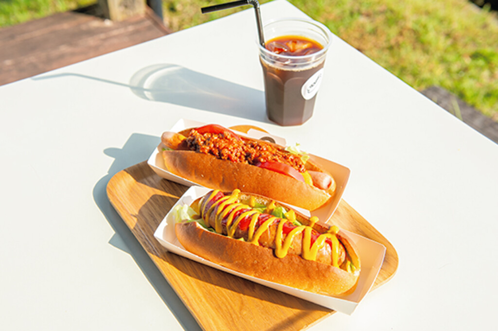 阿蘇市一の宮町の田園風景の中にひっそりと佇む「ヒバリ工房」。敷地内の「ヒバリカフェ」では工房で作られた金賞受賞ソーセージを挟んだホットドッグが名物で、店内の大きな窓越しや、テラス席からは阿蘇五岳の大パノラマが広がる