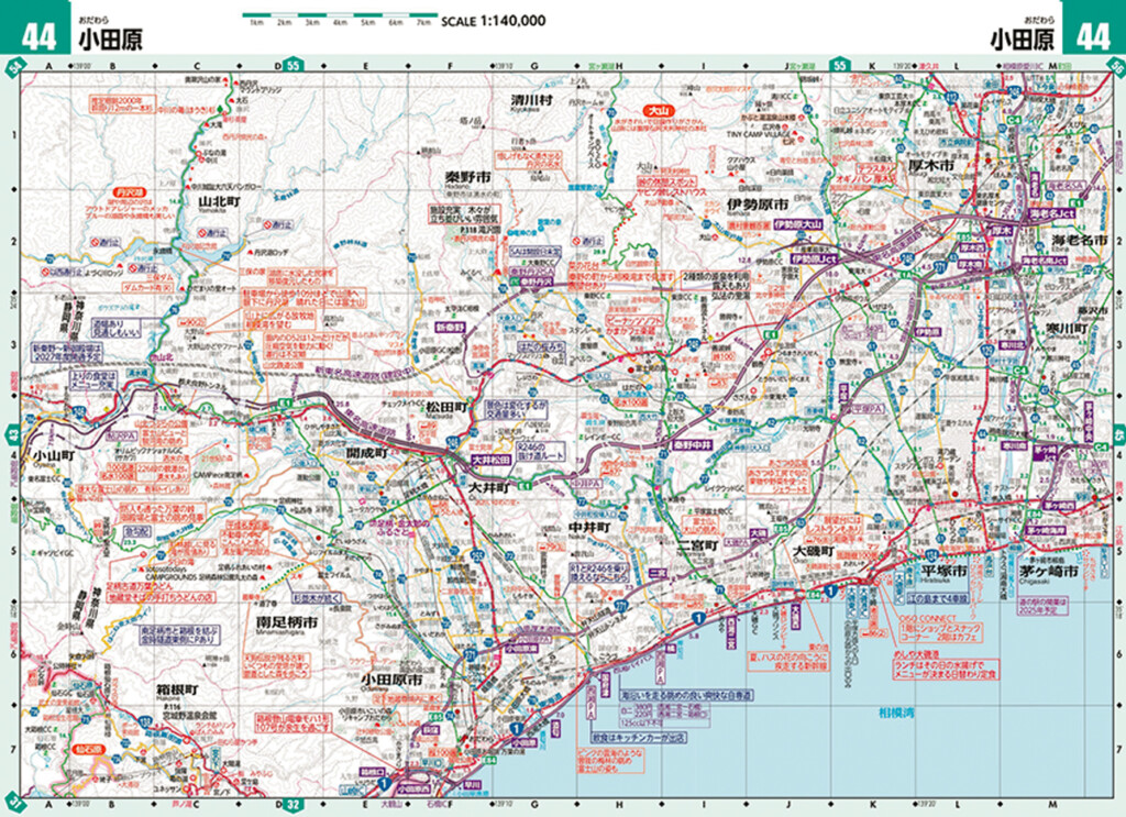 まず言いたいのは、紙地図はライダー向けの情報量が段違いだということ。上の図のように東京〜箱根間のルートをパッと見ただけでも、紙地図にはさまざまな情報が掲載されているのが分かる。もちろん、渋滞情報や所要時間などスマホのナビでしか得られない情報もあるが、「旅を充実させる」という意味では食事、道、温泉などの情報が多数掲載されている紙地図に軍配が上がるだろう。