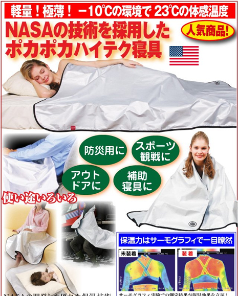 アメリカ「NASA」のスペースシャトル用の断熱材を作る技術を転用して作られた「サーモフレクト」という特殊な素材が、体から出る熱を反射し、更にその熱を蓄えるという優れもの。これを毛布のように寝袋の上にかけたり、寝袋の中でこれにくるまったり、テントの床に敷いたりすると、寒さがかなり和らぎます。とても薄くて軽いので大した荷物にならないのもうれしいのです。