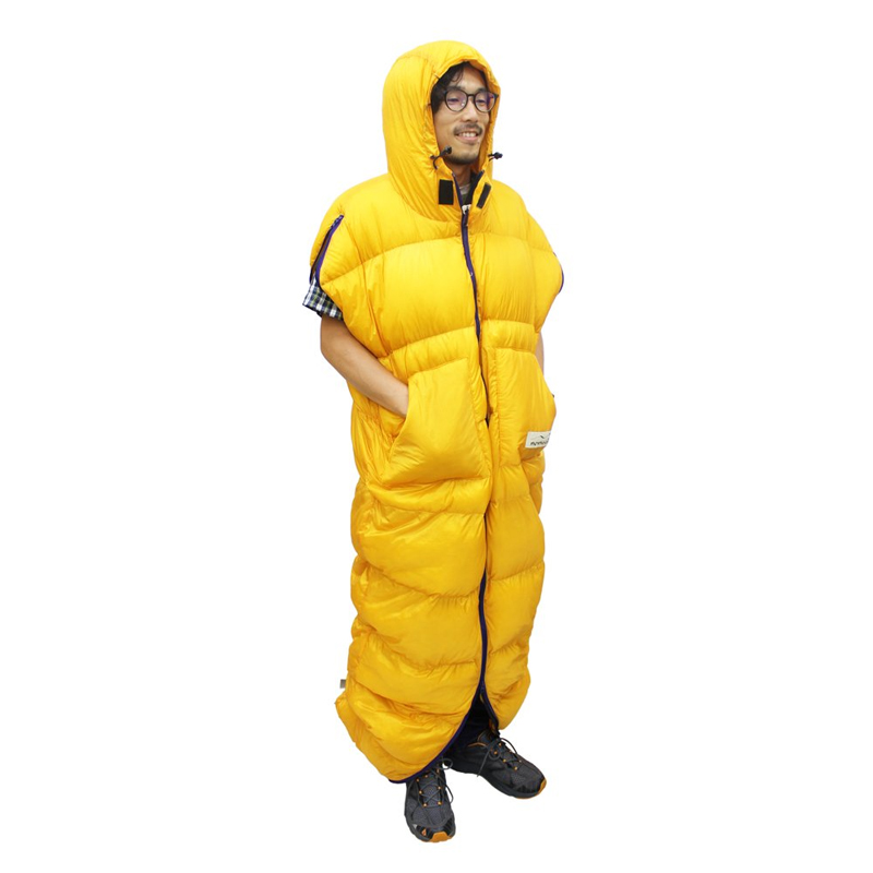 手足を出して“着て歩ける”寝袋。テントの外で過ごしている間、これを着ていると全身ぬっくぬく。防寒着の数を減らすことができます。寝るときは3シーズン用の寝袋と重ねて使えば快適温度は-10℃くらい~。フードがついているので夜中に頭がスースーして起きることもなくなりました。