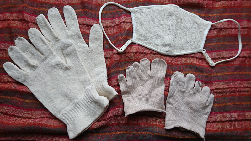 左から、手袋、マスク、5本指つま先ソックス。これらがあるのとないとでは暖かさがまるで違う、小さな巨人たち! シルクは吸湿放湿性・通気性・保温性に優れているので、例えばつま先ソックスをいつもの靴下の中に履くと、湿気冷えを防ぎながら暖めてくれます。特に溺愛しているのはマスク。顔が寒い夜、寝袋を頭からすっぽり被ると口周りが息で濡れてしまい寝袋の劣化の原因になりますが、シルクマスクをして寝ると顔が心地よく暖かいうえに、紙や綿のマスクに比べて息もしやすくて朝まで快適なのです♪(個人的にはネグジルインナーのフードを深くかぶってシルクマスクをする組み合わせが最強快眠コンビ!)