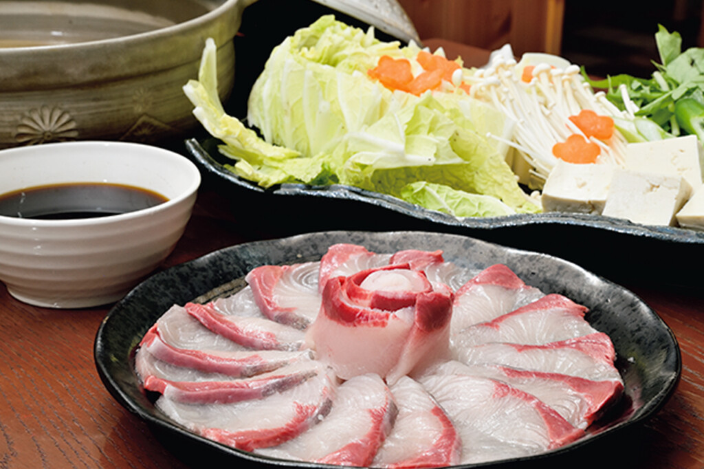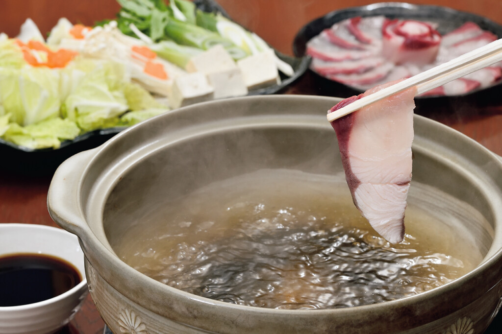久良のぶりの身を、しゃぶしゃぶのように出汁にくぐらせて食べる鍋料理。脂がたっぷりのブリは、刺身のまま食べられるほど新鮮。野菜はもちろん、ポン酢も愛媛の柚子&じゃばらで作った「とみぽん」と地元食材にこだわる
