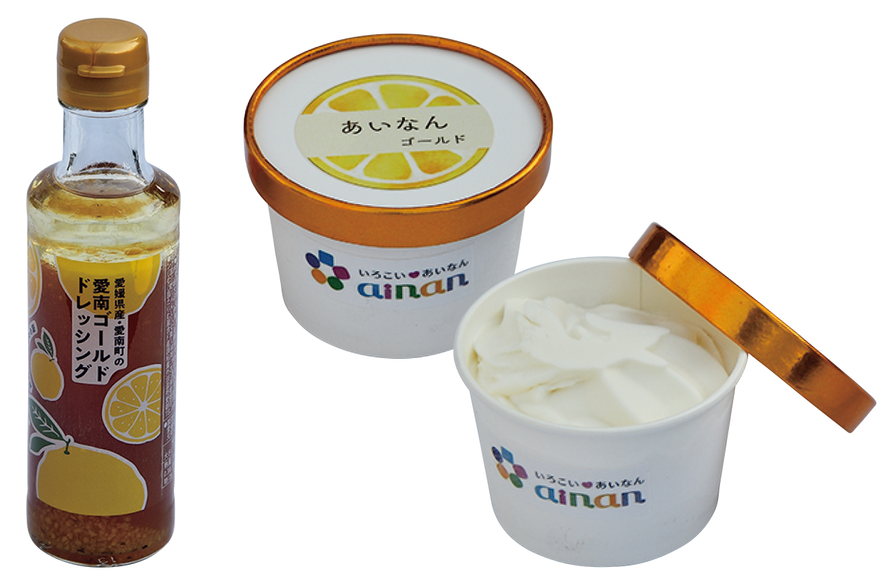 GW前から秋頃まで販売される人気のソフトクリームをカップに詰めた愛南ゴールドアイス(300円)。果汁を贅沢に使った愛南ゴールドドレッシング(650円)など愛南ゴールドを使った商品がいっぱい揃う