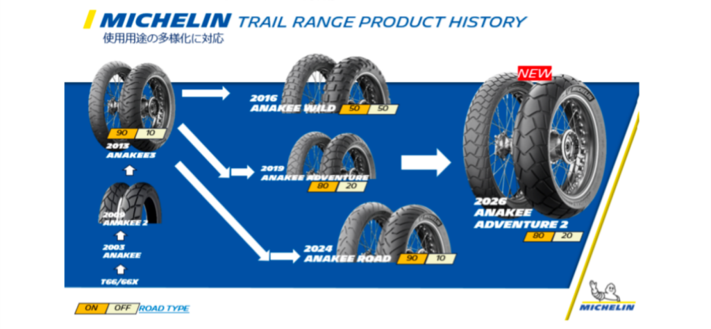 ミシュランタイヤはADVENTUREユーザーの様々な使用用途に応じたラインナップを拡充。今回発売のANAKEE ADVENTURE 2はANAKEE ADVENTUREの後継となる。なおANAKEE ADVENTUREは継続して販売される