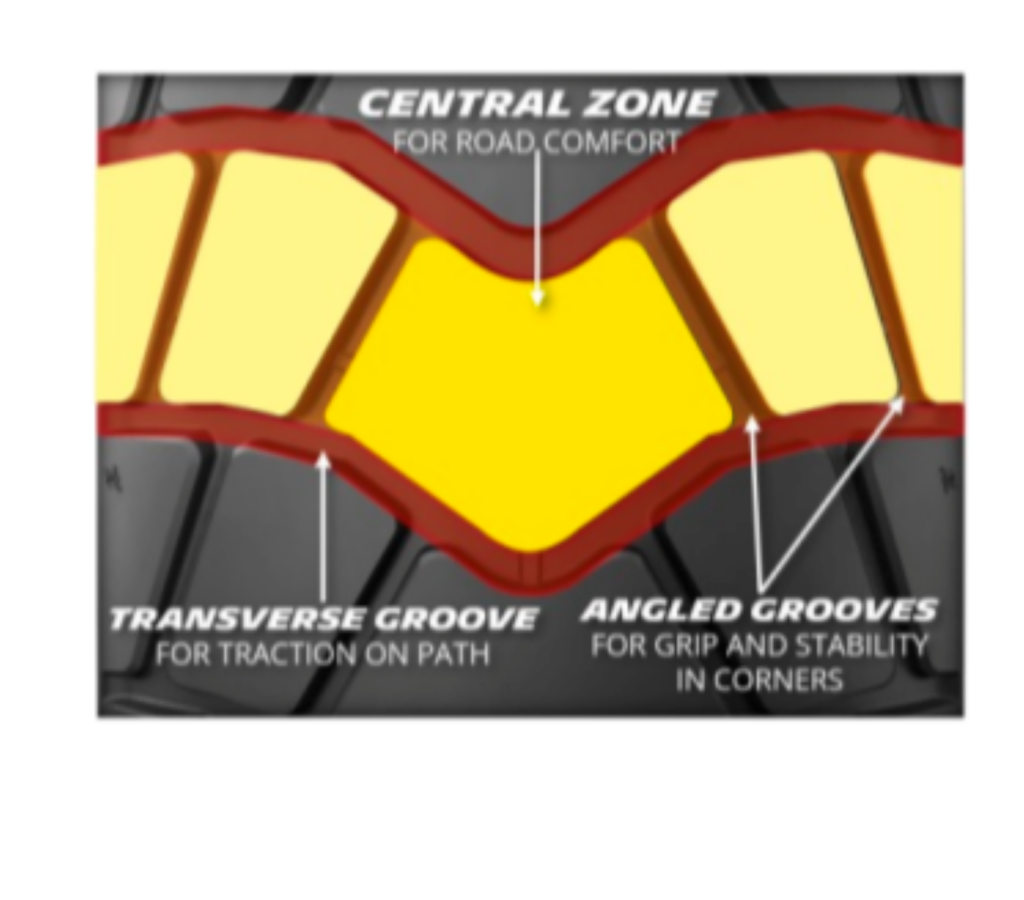 シリカを配合した2種類の異なるコンパウンドを使用することで、中央部は長寿命、サイド部はコーナリング時に優れたグリップを提供する