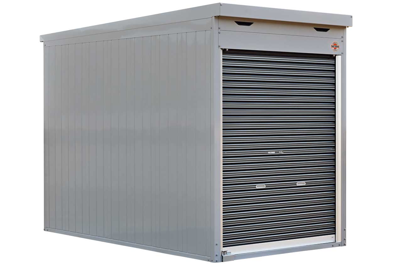 ゆとりある設計で床面積も広く、大型バイクや複数台体制にも対応可能。シャッター錠、シャッターガード、ラウンドロック装備で盗難防止に配慮。土間工事不要なのですぐに使用できる