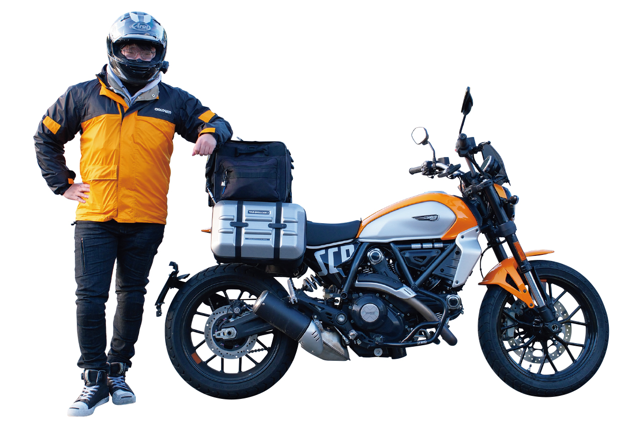 鮮やかなイエロー×ブラックのツートンジャケットが目を引いたが、じつは直前まで降っていたという雨対策で着ていたレインウエア。それを脱ぐと現れたのは、シルバー×ブラックのツートンジャケット。まさに愛車のスクランブラーアイコンのように、シーンに応じて装いを切り替えるスタイルが印象的だった。