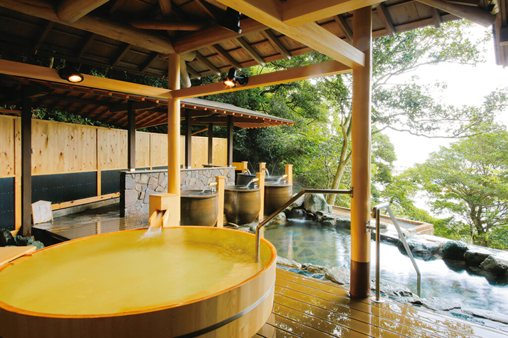 9つの温泉地に50軒を超える旅館やホテルが集まる鳥羽温泉郷。その中で戸田家は、天保元年創業という歴史を誇る鳥羽エリアの老舗宿だ。館内には「戸田家温泉村」と名付けられた温浴施設が整い、鳥羽湾を一望する露天風呂をはじめ、足湯や5種類の貸切風呂など、多彩な湯船で三重を代表する名湯を満喫できる