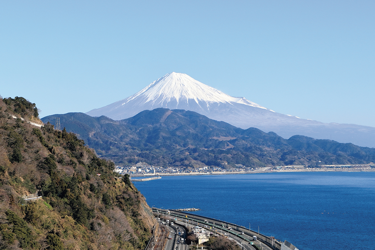 江戸時代に歌川広重が、「東海道五拾三次之内由井 薩埵嶺」として描いた浮世絵の構図と似た景色を楽しめるのが、現在は遊歩道となっている旧東海道沿いの薩埵峠展望台。国道1号バイパスと東名高速と東海道本線という日本の大動脈が、個性ある富士山絶景を生む