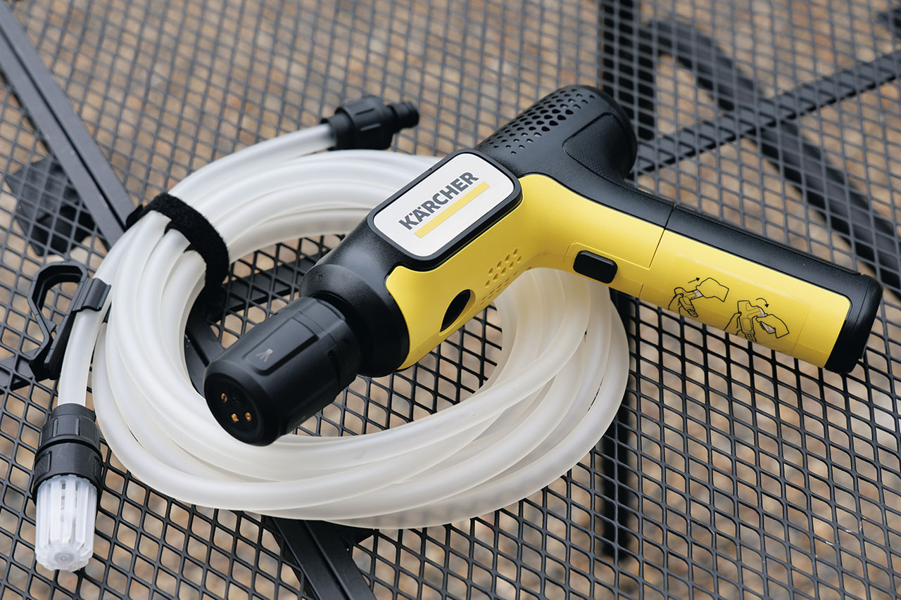 仕事柄、似たような製品を色々試す機会を得たのだが、“クルマに積んでる20Lの水でどこまで洗車できるか?”の基準で選ぶと、このケルヒャーのハンディエアが“洗浄力”と“水の消費量”のバランスが僕にはベストという判断に至った。洗浄パワーはACコンセントを使う本気の家庭用高圧洗浄機には敵わないけど、すぐさま使える手軽さは大きなアドバンテージ。コンパクトなのでクルマに常に積みっぱなしにできて、キャンプや車中泊といったアウトドア遊びでも大活躍している。