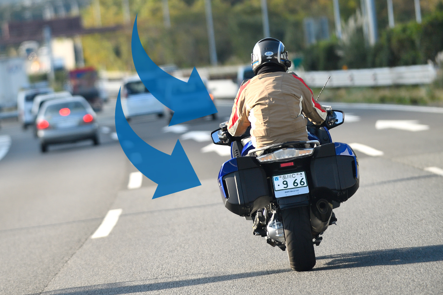 また、リヤブレーキを軽く踏んだり、場合によってはフロントブレーキをかけるのも効果がある。でもコレは、ずっと使い続けられないので、突風が吹いたときや吹きそうな場所(橋やトンネル出口)の備えとして使う。
