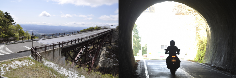 山間部の橋やトンネル出口は、地形的に谷になる場合が多く、強い横風が吹き抜けやすい。差しかかる前にニーグリップを強めたり、ギヤを下げたりして備えておこう。同時にこのような場所は、路面が冷えていて滑りやすくなっていることも忘れずに!