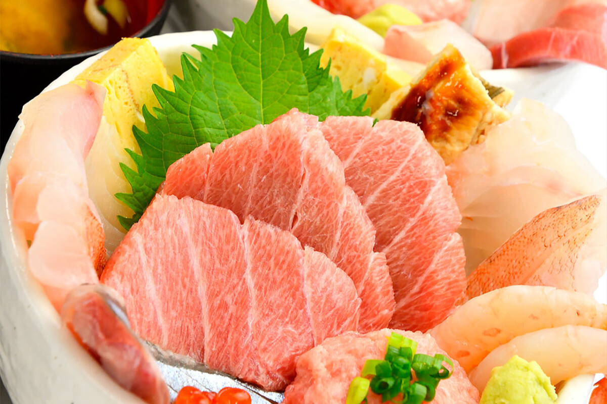 そしてついに我々は、同市場の食事処「万祝(まいわい)」のテーブルについたのである。目の前の丼には、今にもがこぼれ落ちそうな勢いでお造りが盛られている。