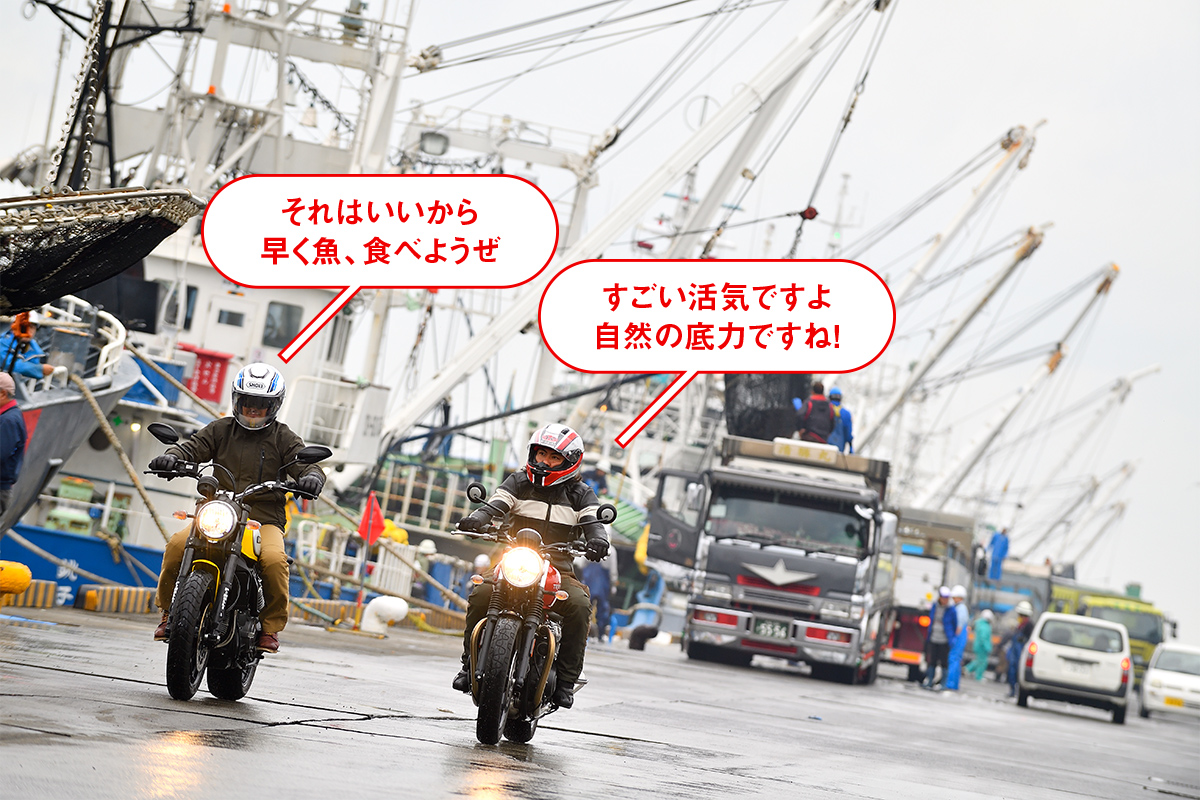 お昼に、銚子漁港でうまい魚さえ食べられればいい。あとは気の向くまま、心のままで、ほとんどノープランだ。そしてオレと編集タカタが走らせるトライアンフ・ストリートツインとドゥカティ・スクランブラーは、こういったルーズなツーリングに最適である。
