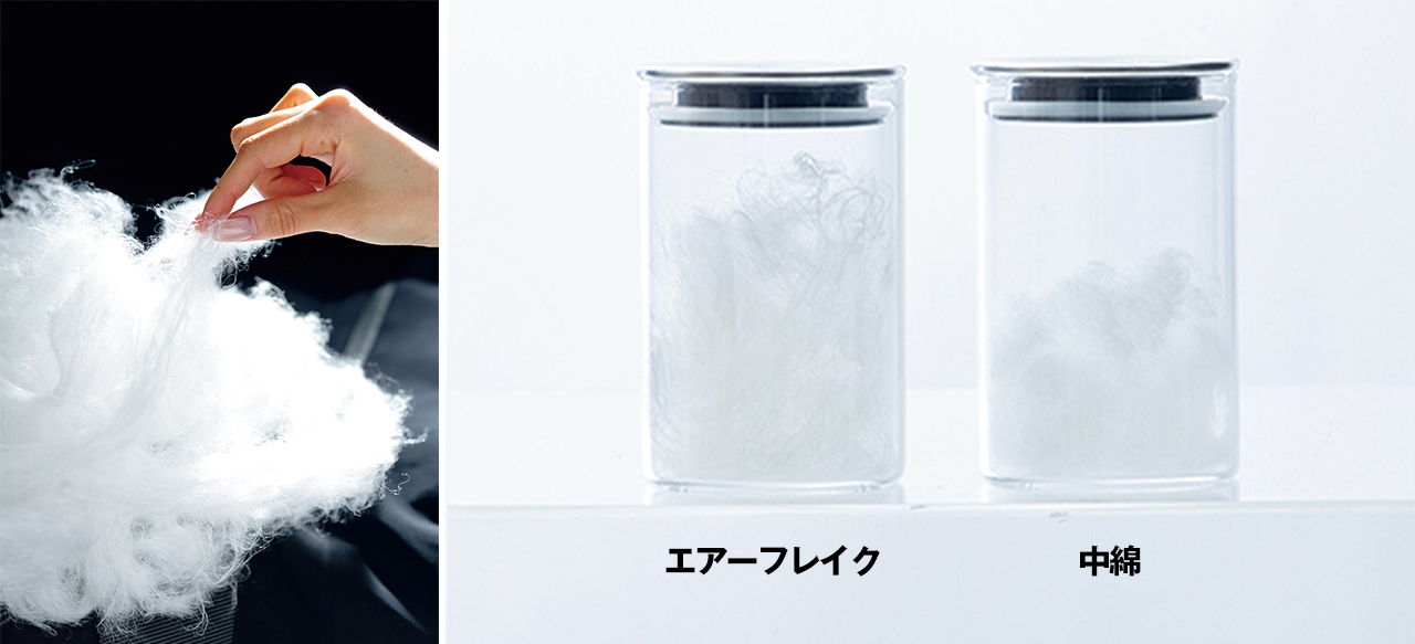 羽毛に比べて化学繊維の中綿は重いと言われるが、エアーフレイクはその概念を払拭。繊維を複雑に絡み合わせることで大量の空気を抱え込む独自の構造を開発したのだ。それにより高い保温性と柔らかさ、弾力性、復元力などを実現。少量でも十分な性能が得られるので軽量に仕上げられる。また洗濯が容易なのも特徴。家庭で気軽に洗えるので、長く使えるのだ