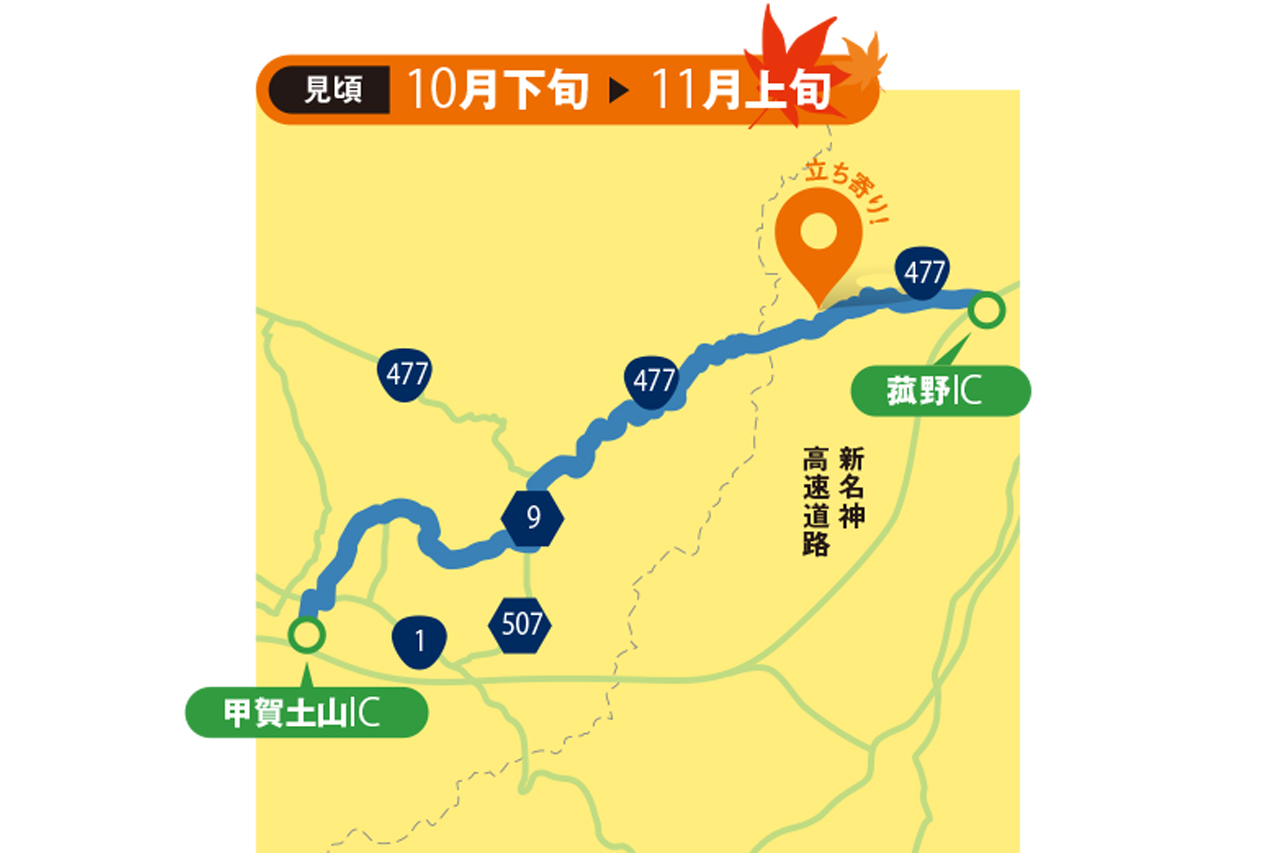 三重県と滋賀県を結ぶ鈴鹿スカイライン(国道477号)は、鈴鹿山脈を横断するワインディング。秋は10月下旬頃から木々が色づき始め、谷や稜線を鮮やかに彩る。石槫峠周辺や武平峠からは鈴鹿の山並みと紅葉を一望でき、走りと絶景を満喫できる。道幅は狭く急カーブも多いため、安全運転で楽しみたいルートだ