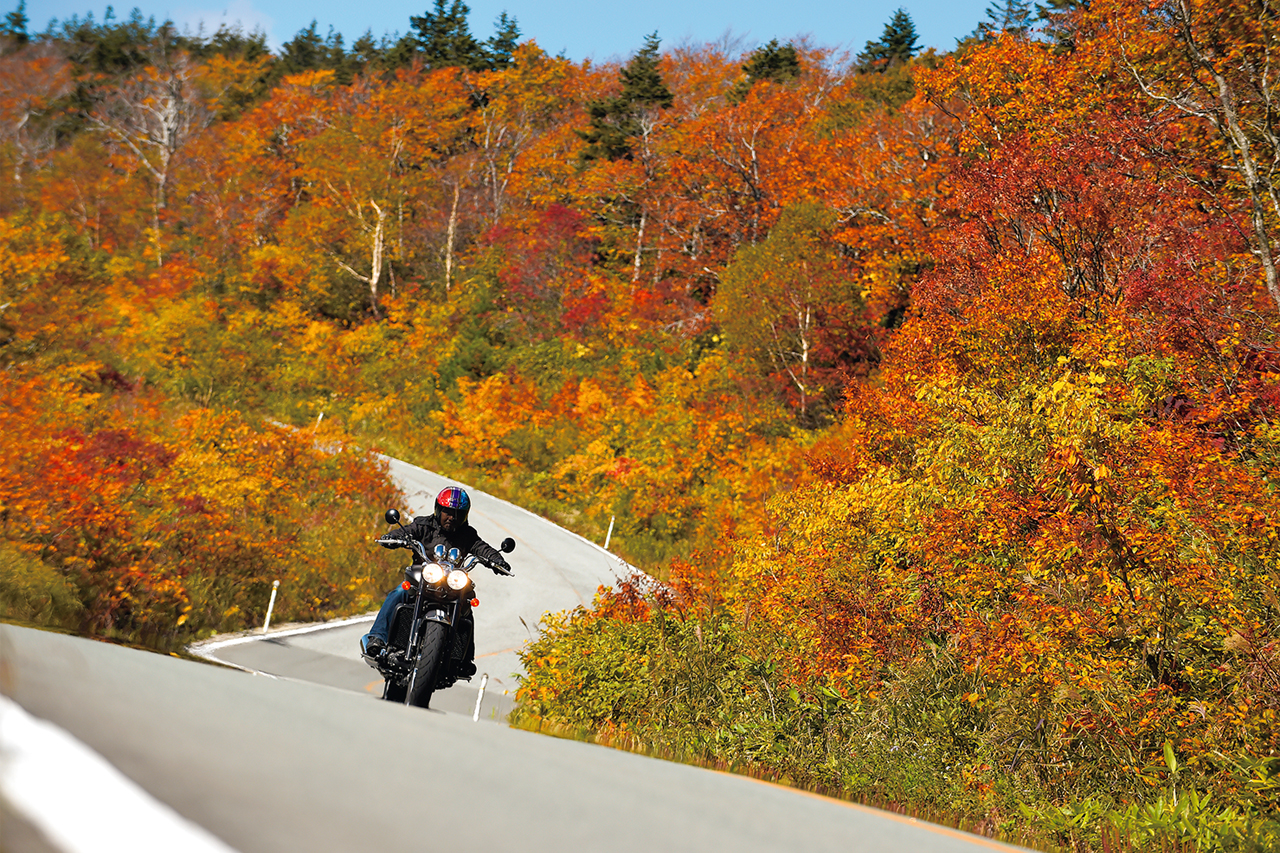 高原の風が気持ちいいスカイライン。見晴らしの直線と軽快コーナーが交互に現れる。秋はカラマツの金色トンネルで写真も映える。鹿の飛び出しに注意