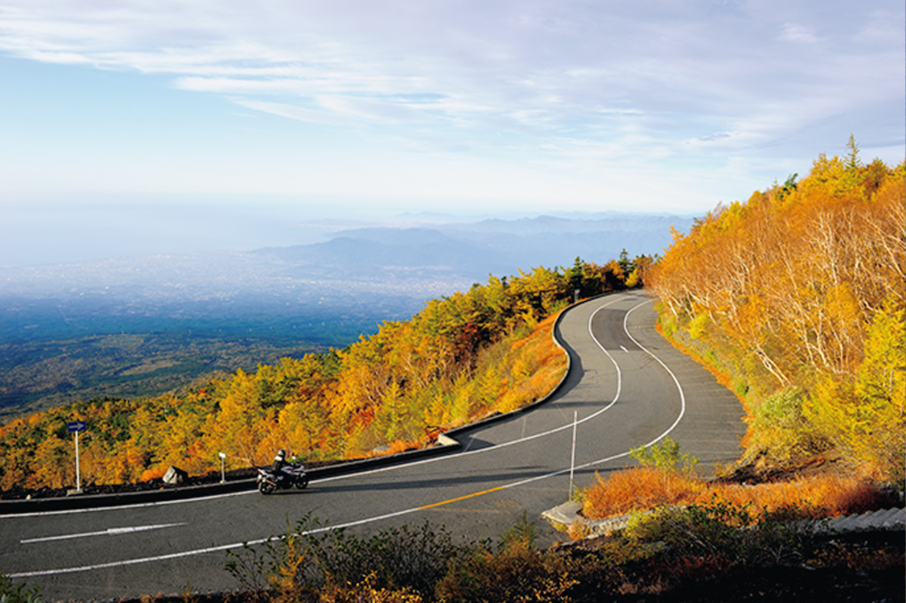 標高を上げるごとに景色が切り替わる名ルート。路面は良好だが気温差大。秋は赤や金の樹海越しに富士を望むことができる