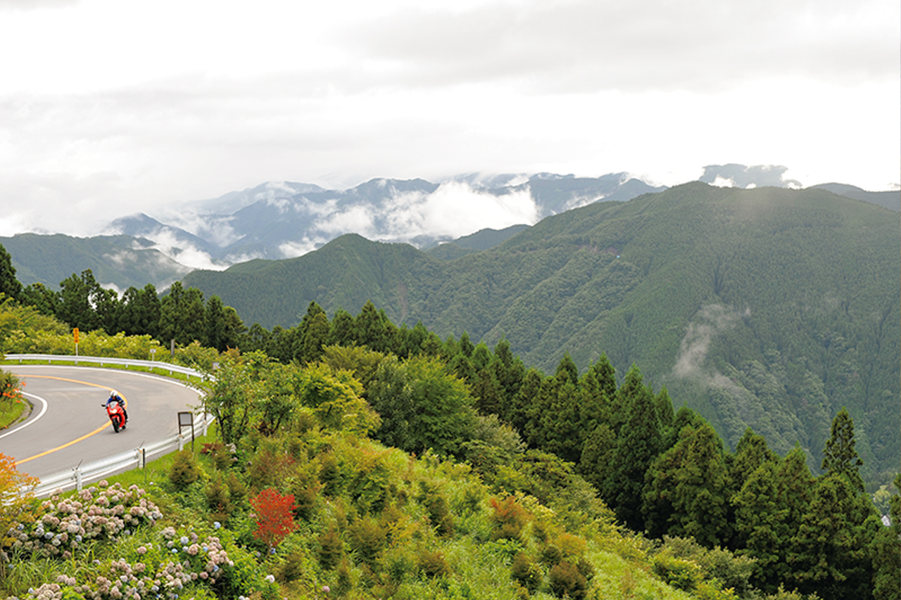 修験の山を貫くロングツーリング向け快走路。秋は深い森が濃い赤に染まる。温泉立ち寄りも◎。標高変化で寒暖差が大きい。夕方は動物の横断に注意