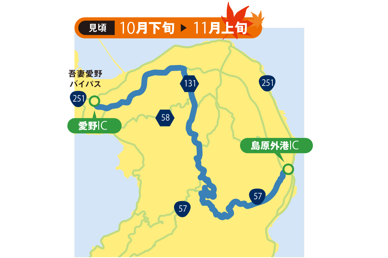 普賢岳を望む山岳ワインディングで10月下旬〜11月上旬にかけてカエデやツツジなどが色づき、山全体が鮮やかな紅葉に包まれる。ヘアピンカーブが連続する道は走り応えがあり、展望所からは有明海や天草の島々まで一望できる。紅葉と火山の迫力ある景観を楽しめる、九州屈指の紅葉ツーリングルートだ