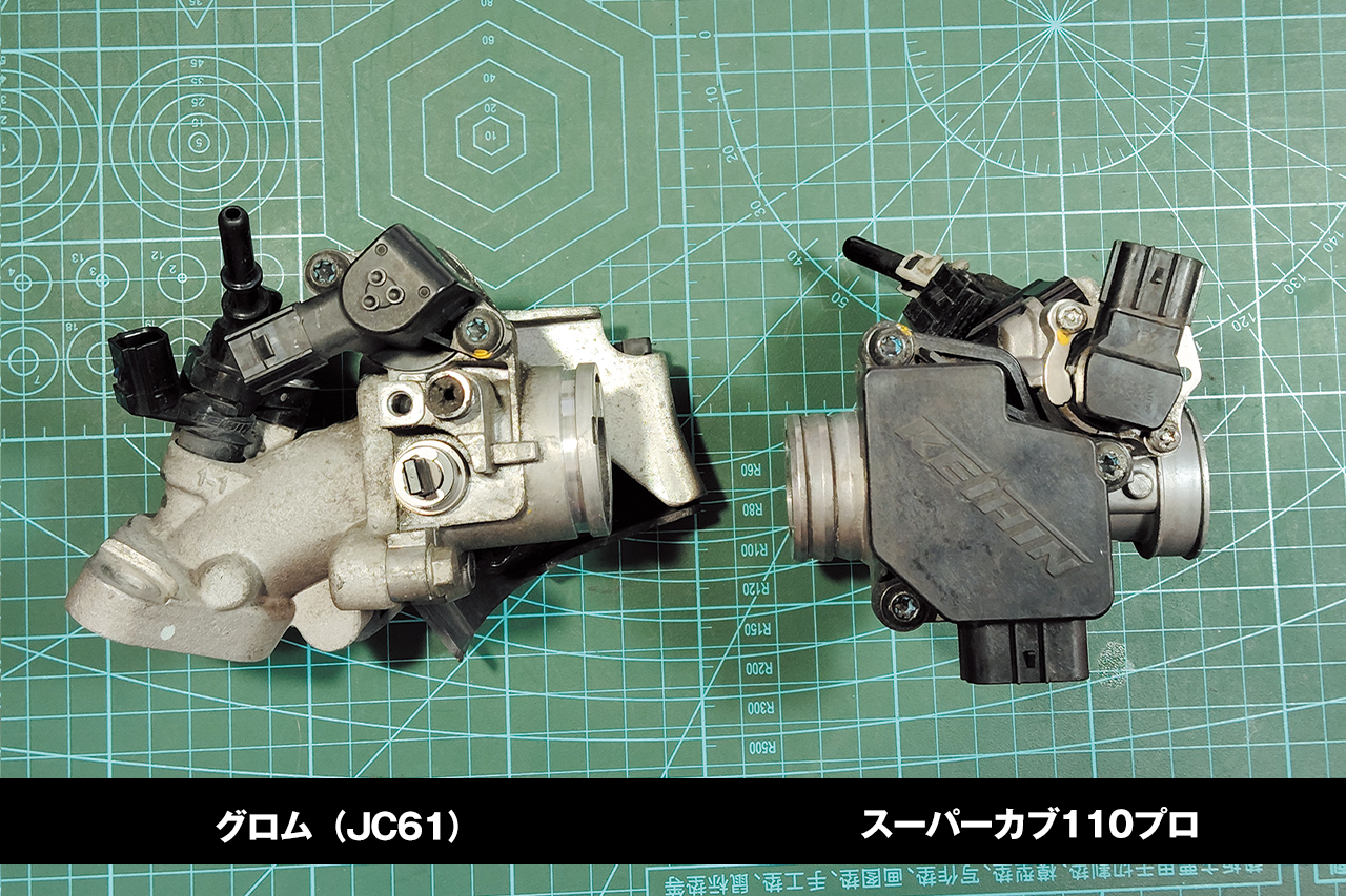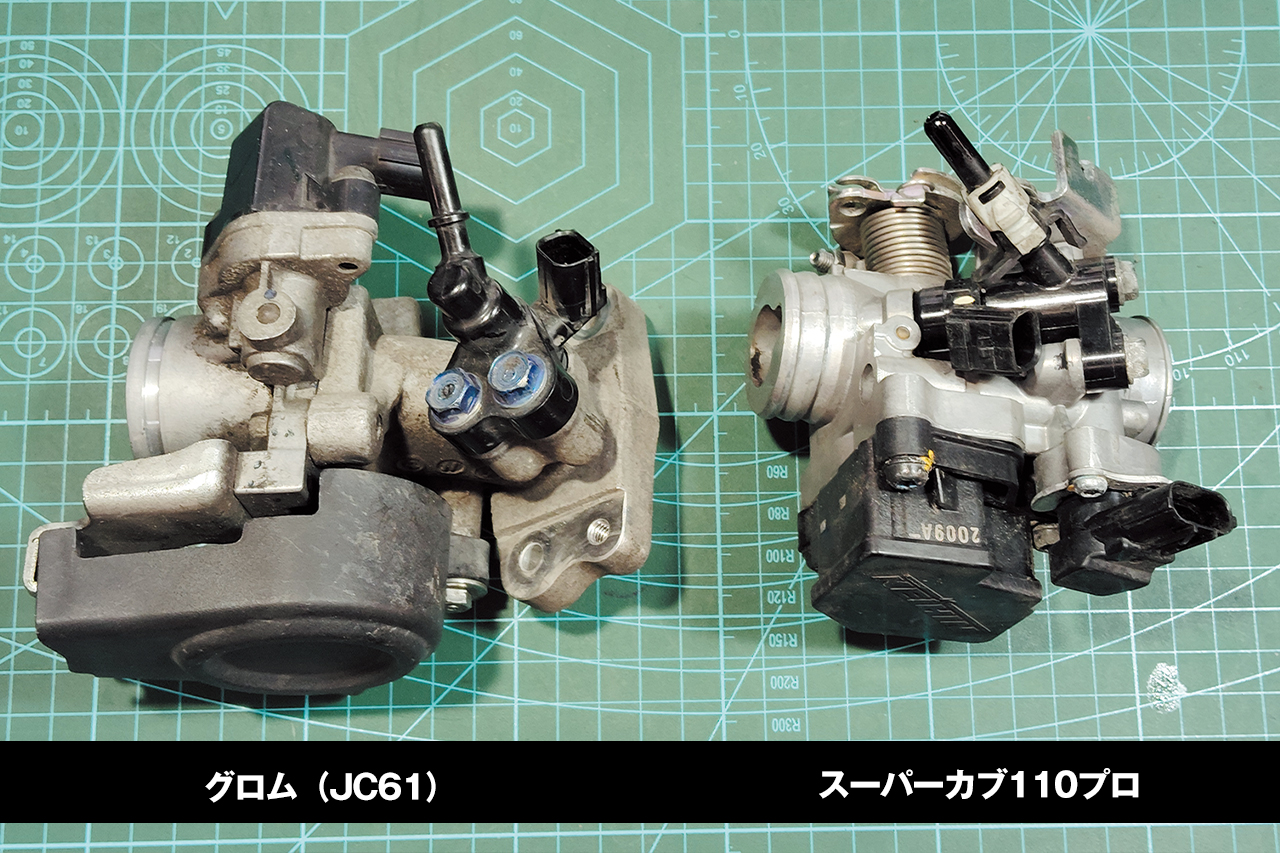 スーパーカブ110プロとグロム(JC61)のスロットルボディを比較してみた。この2つでは構造は全然違いますが、カブ系はFIのカブであればどれも似たような作りだし、グロム系はモンキー125やダックス125がほぼ同じでしょう