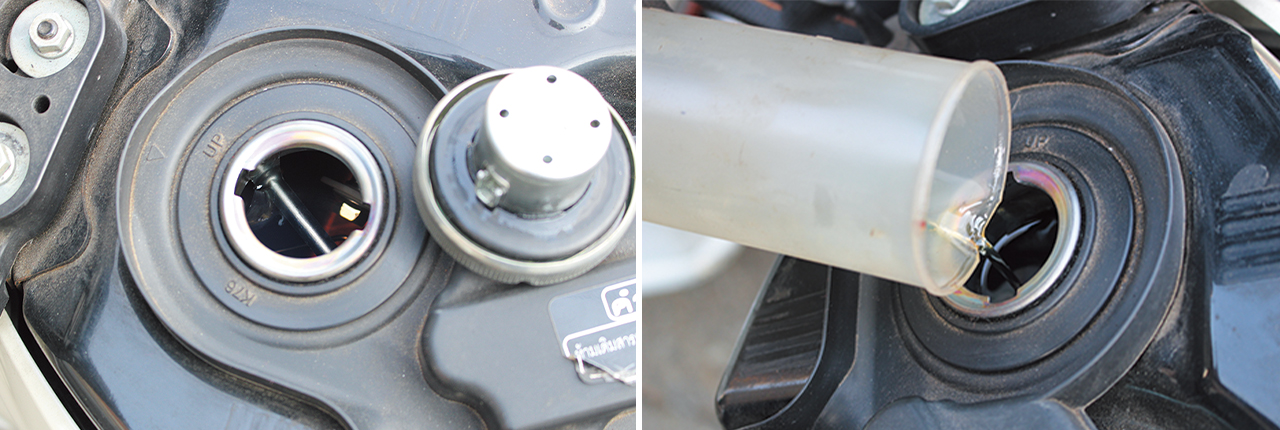 C110カブの場合はガソリンタンク容量4Lチョイなので20ml程度のホンのちょっと。洗浄効果を効果的に発揮させたいなら初回と2回目の給油時に入れる。その後も毎回給油時に入れれば最大限のキープクリーン効果を持続だ!