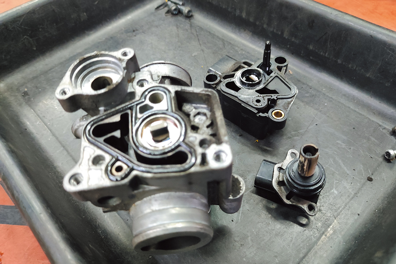 FIカブレーサー製作時にどーにも調子が出なかったのでスロボを外してチェックしたら、カーボンなどで汚れまくっていてスロボ内が真っ黒でした。太洋モータースさんで清掃します!