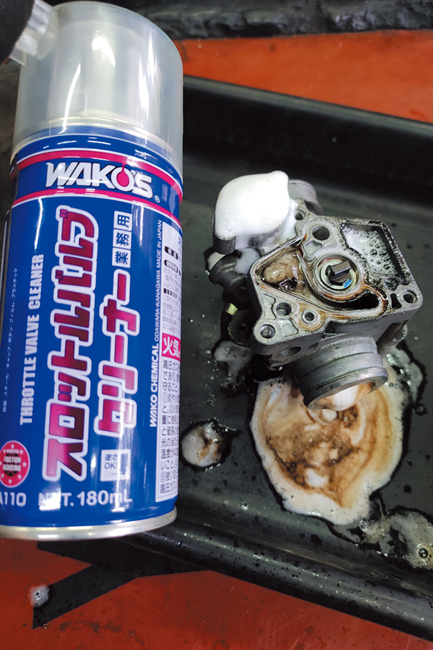 ワコーズのスロットルバルブクリーナーを使用してクリーニング。内部に付着したカーボンなどの汚れを溶かしたりして落としてくれます!