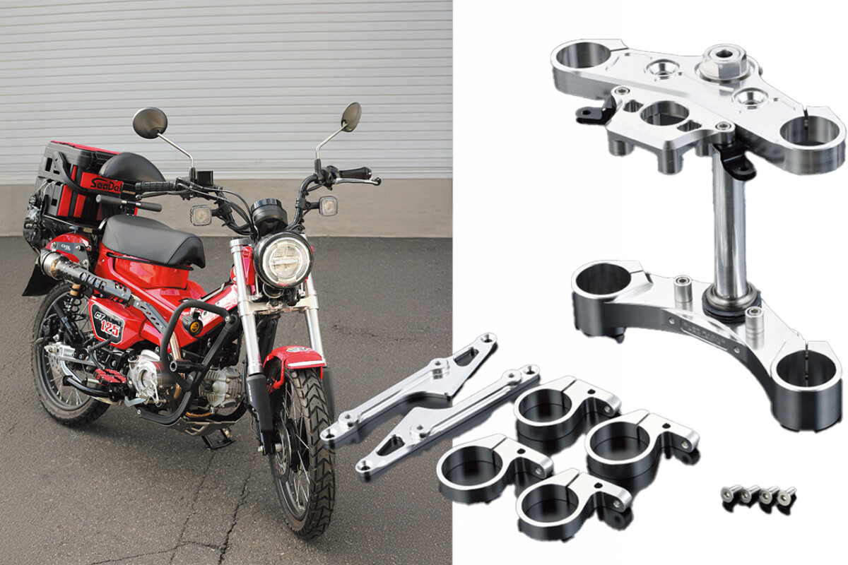 OVERが製作したDAX125の倒立フォークを移植したCT125カスタムは、見た目だけでなく走行性能も桁違い。リアショックも同時交換することで、CT125がまるでロードバイクのような動きに激変しました