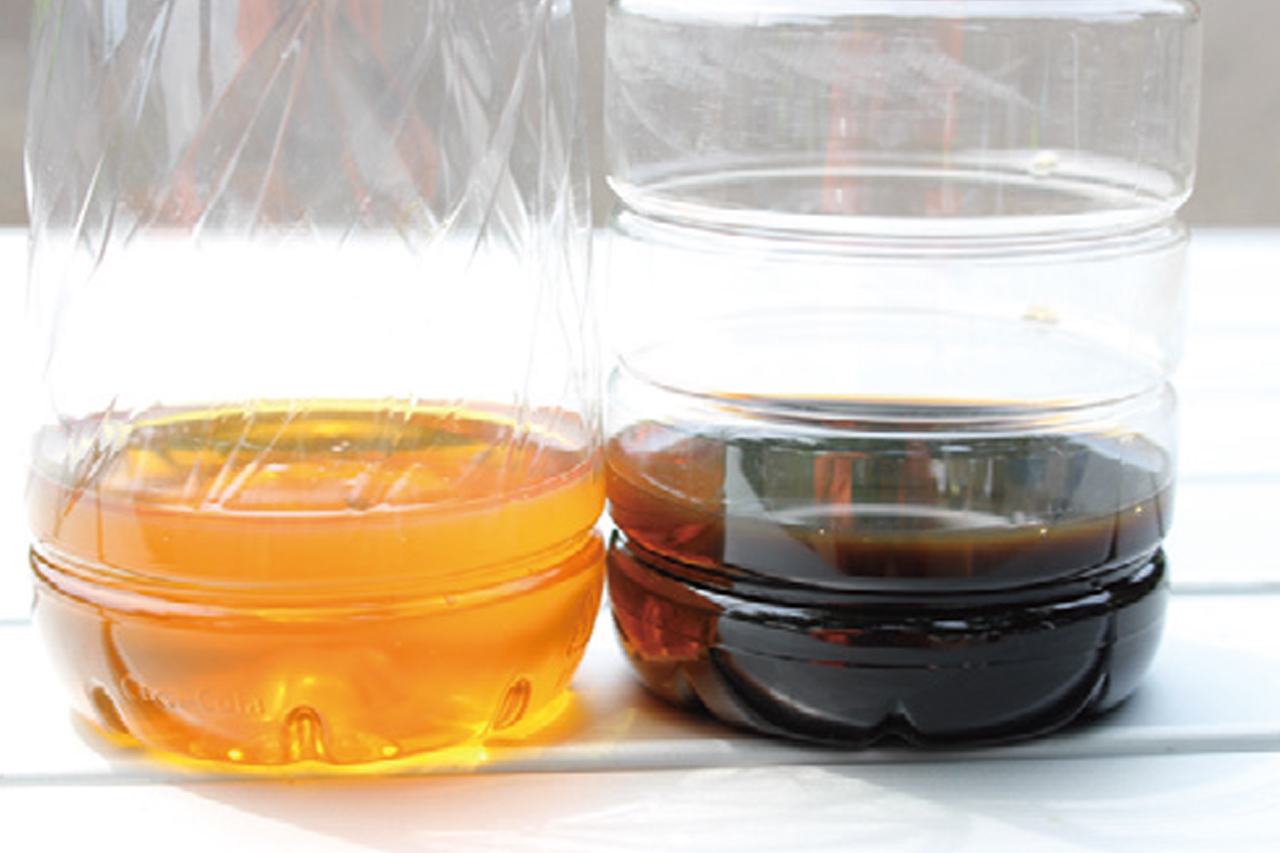 約2000km走ったオイルと新品のユニルオパールMYTHICの比較です。使い終わったオイルには排ガスや湿気による水など様々な不純物が混じっているため、それらがエンジン内部を駆け巡っていると思うと……。なるべく早めのサイクルで、新しいオイルに変える方が絶対良いでしょ!