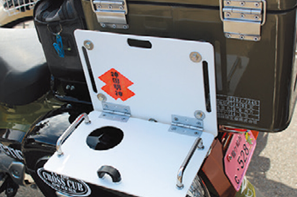 得意の自作加工でアイデア満載のクロスカブ。普通には付けられないステアリングダンパーは縦装着でフィット! テーブルは内径10mmの光製アルミパイプを板下部のボルトに装着させると、簡易テーブルとして運用が可能に! 出先でのコーヒータイムもくつろげる!! Youtube『軽四駆倶楽部』も見て欲しい!