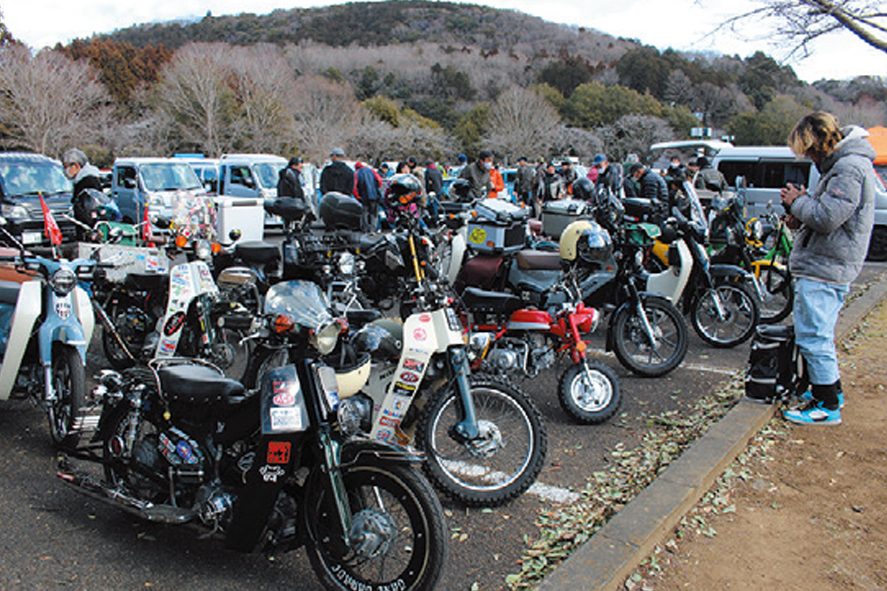 老舗のカブクラブの水戸藩カブがやっている「軽トラ&カブ集まれ~!」な異色のイベント。水戸藩カブが主催だけあってC100を始めとしたOHVカブが多く集まる傾向ですが、OHCを始めとした車両や現行FIモデル、そしてモンキーやその他4ミニも軽トラに乗せたり自走だったりしてドンドコ集まってきます!カブミーティングというと自走が基本だし、四輪駐車場が狭いこともある。しかし、遠くから出発する人やポンコツ車の場合は積車でなければ難しい場合も。そんな中、このイベントでは積車で来ることが基本になっていて、自慢の車も愛するカブも同時に見せられるという趣向なのだ!これは他にはないので10年後には『24時間1000キロチャレンジ』に続く名物イベントになることでしょう!その頃は阿久津さんは生誕100歳!