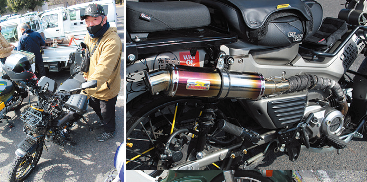 カスタムパーツキット「ラリーキット」を装着した上にメインフレームには「スチューデント」キットのメッキガードも装着したC100T。そしてSS50のようなタンクを付けている方は「ロードスター」を組み込んだCM90ベースのCT90エンジン搭載車。オーナーは共に埼玉からお越しの下妻さん