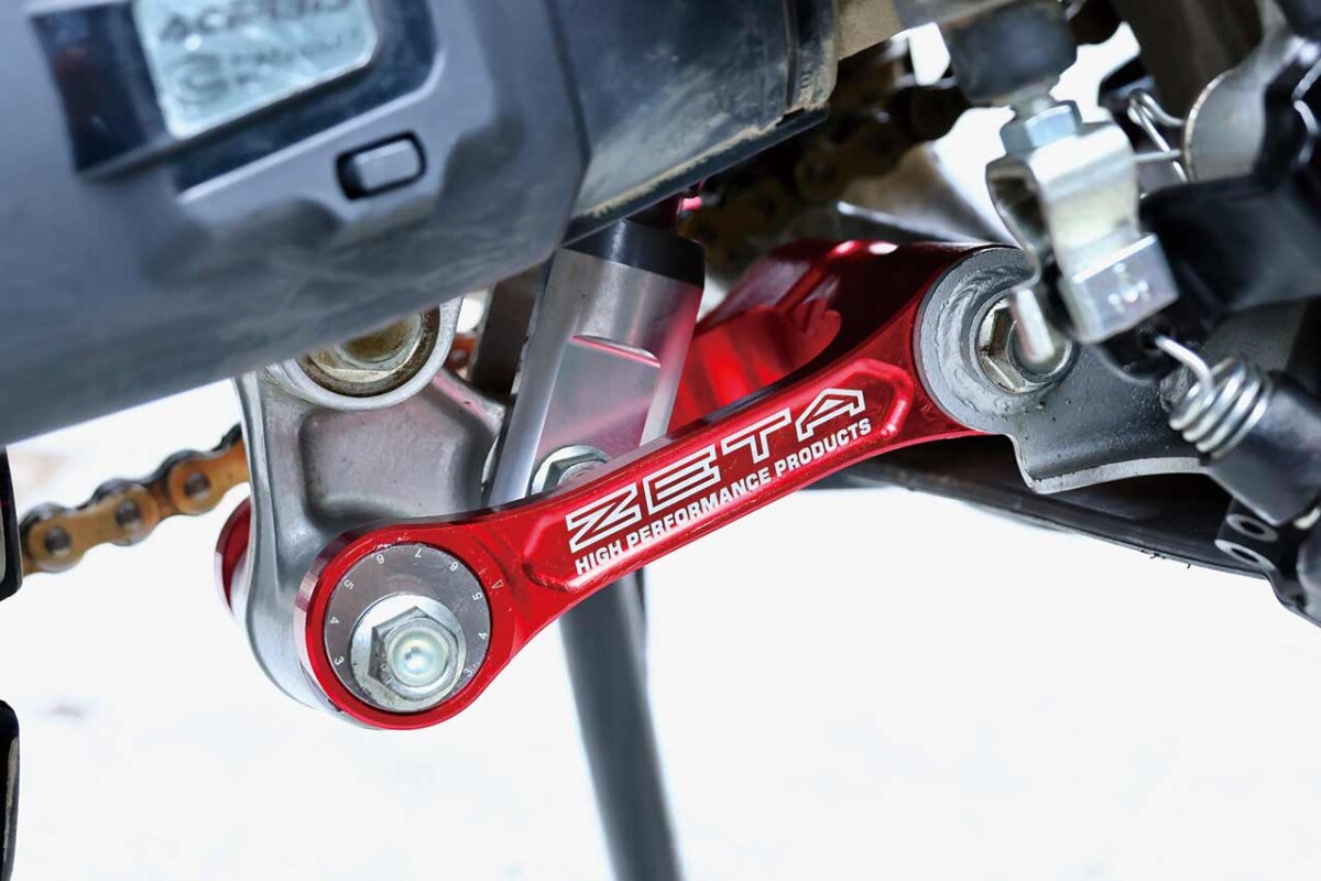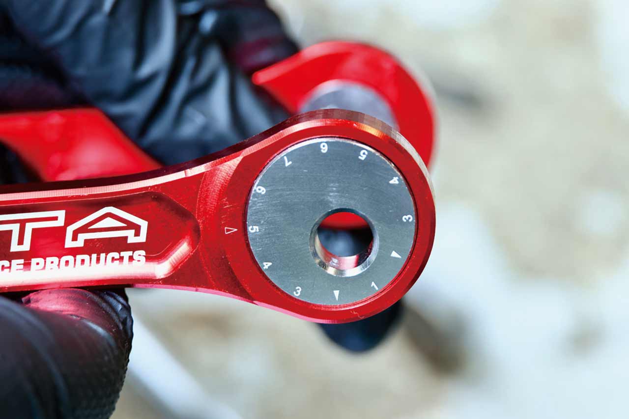 日頃から足つき性を求めているライダーにはもちろん、例えばガレ場などテクニカルなエンデューロ用に手軽に車高を落とす用途にも便利だ。リンクレバー比の変更によってリアサスペンションの操作性も影響を受ける(低くする→柔らかくなる/高くする→硬くなる)ため、サスセッティングや車体姿勢も合わせて調整することでベストな状態を作ることができる。