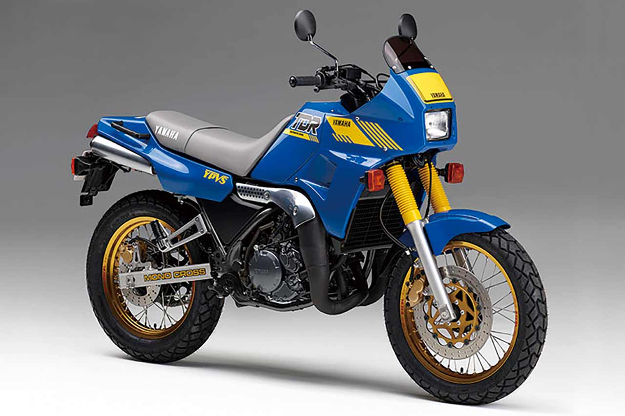 TZR250(1KT)の2ストローク・クランクケースリードバルブ並列2気筒エンジン(しかも自主規制上限の45PS)をそのまま載せてデュアルパーパスモデルを作ろうなんて──まるでマッドサイエンティストの発想だ。そんなことを本気でやってしまったヤマハに乾杯!
