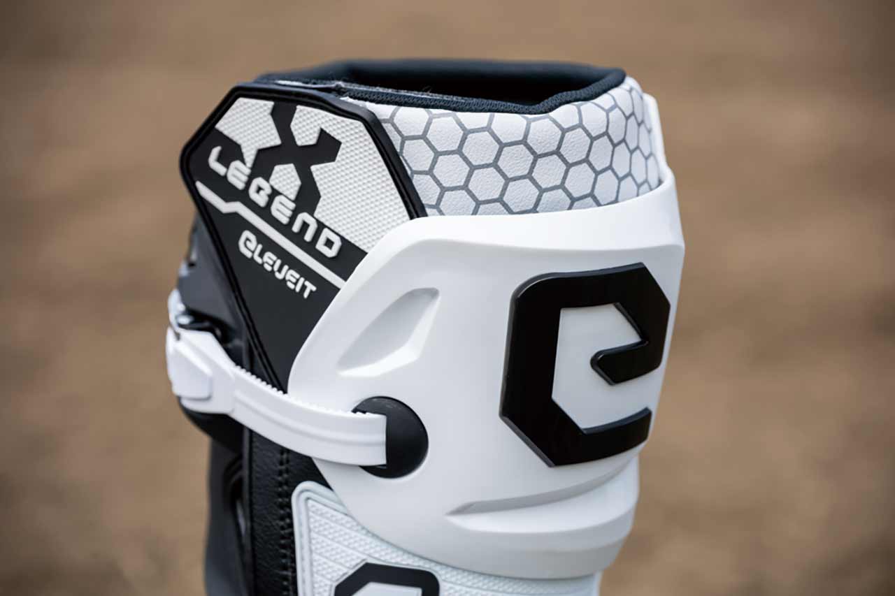 攻めの走りを支える次世代ブーツ「X-LEGEND EVO」は、3,700gという圧倒的な軽さ(他社4,000g)と高いプロテクション性能を兼ね備える。左右方向・前方向の過伸を規制するEleveitフレックスコントロールシステム、後方向の過伸を規制するショックロックシステムを組み合わせることで、剛性としなやかさを高次元で両立。コーナー進入時の微妙な荷重移動も正確にライダーへフィードバックする。