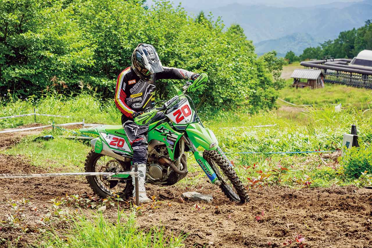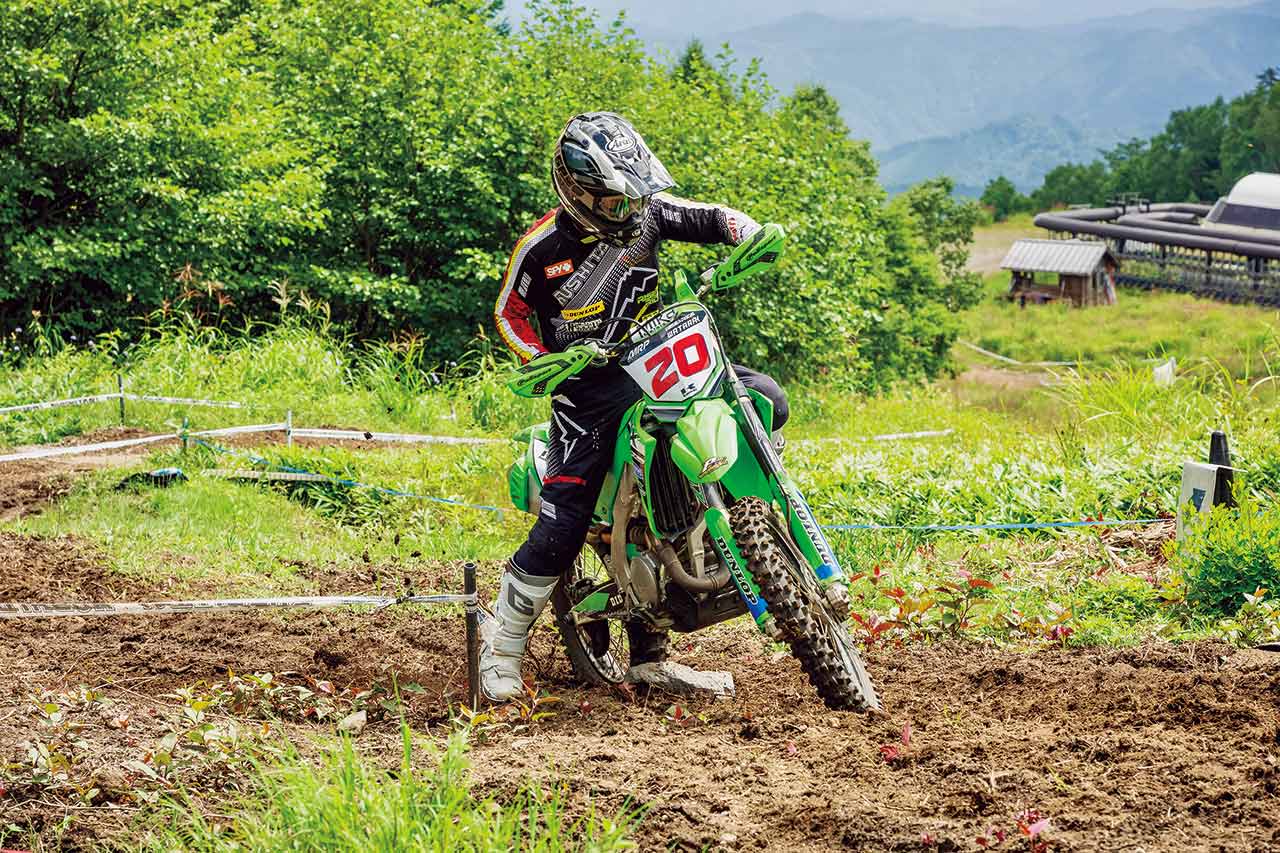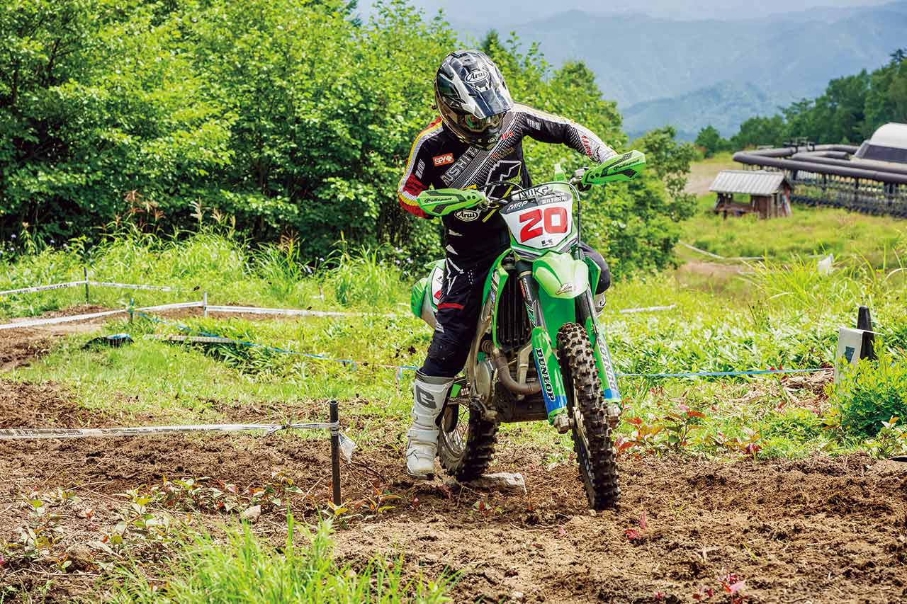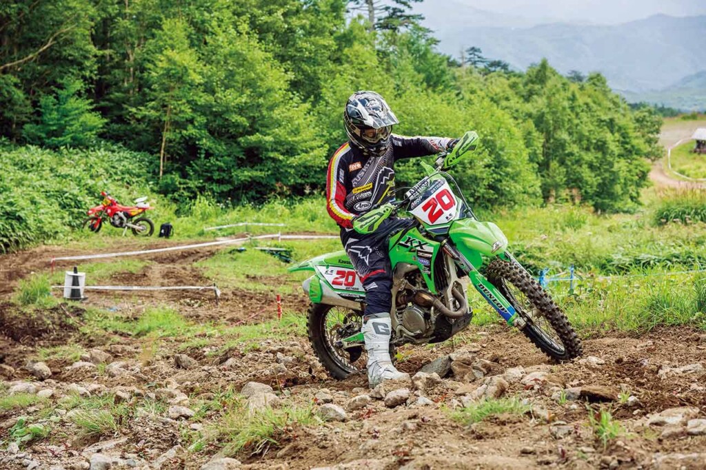 ハンドルではなく、あくまでもステップ加重によってバイクをくねらすようにするのがポイントです。この上りは左側に落ちるキャンバーになっていますが、上級ライダーはファーストトライでマシンが振られたり難しいと感じることで地形を読み取り、ベストラインを見つけます。
