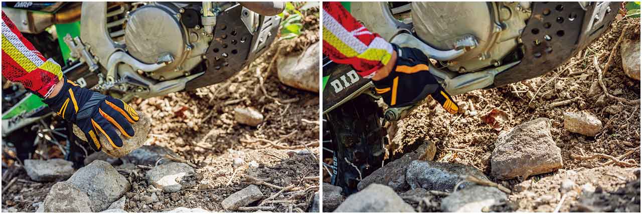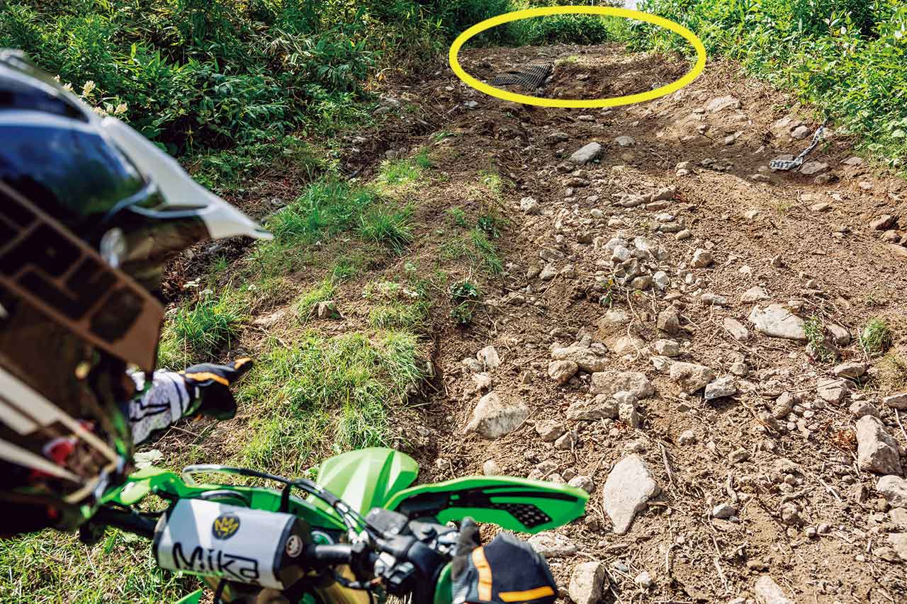 ガレ場の上り坂でハマってしまい、後輪が空転して先に進めなくなることがあります。そんな時は闇雲にアクセルを開けても空回りして溝がさらに深くなりドツボにハマるだけ。まずはなぜタイヤが空転するのかを冷静に考えてみましょう。