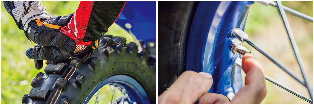 通常の整備ではもちろんタイヤゲージを使って空気圧を管理しますが、現場でいざとなったらバルブを指で押しながら空気を抜くことも多々あります。その際にタイヤを押してみて「このくらい凹むなら空気圧●●キロくらいだな」と感じられるようにしておくことをおすすめします。