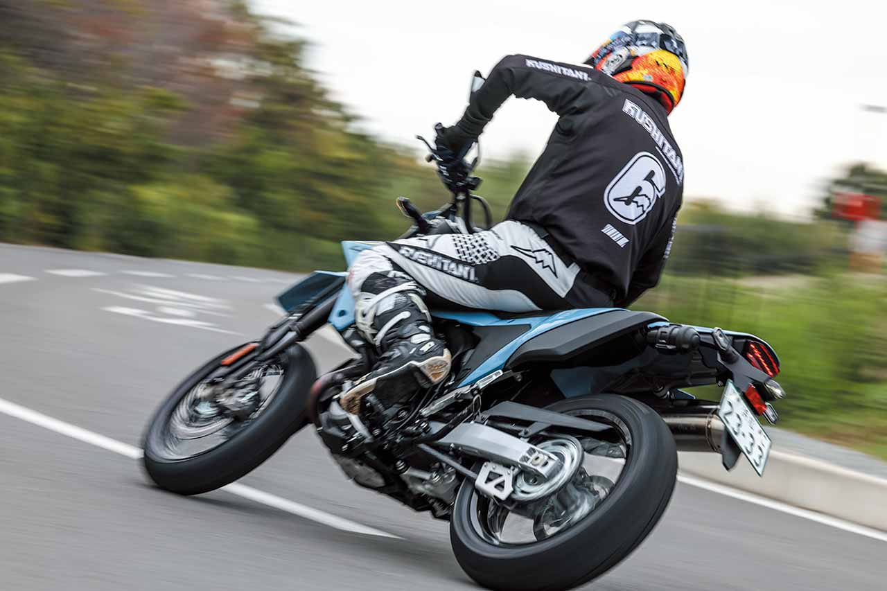 前後17インチのモタードモデルとの縁が薄く、21/18インチのDR-Z4Sに比べると自信を持って旋回できない現在のスキルではあるが、そんな自分でも楽々と扱える許容範囲の広さを感じる。自然な舵角で曲がることができ、スピードコントロールも容易だ。フラットダートも走ってみたが、林道ツーリングもできるポテンシャルを感じた。何より近年、ストリートモタードへの関心が再び蘇ってきたタイミングなので、これはアリだ!