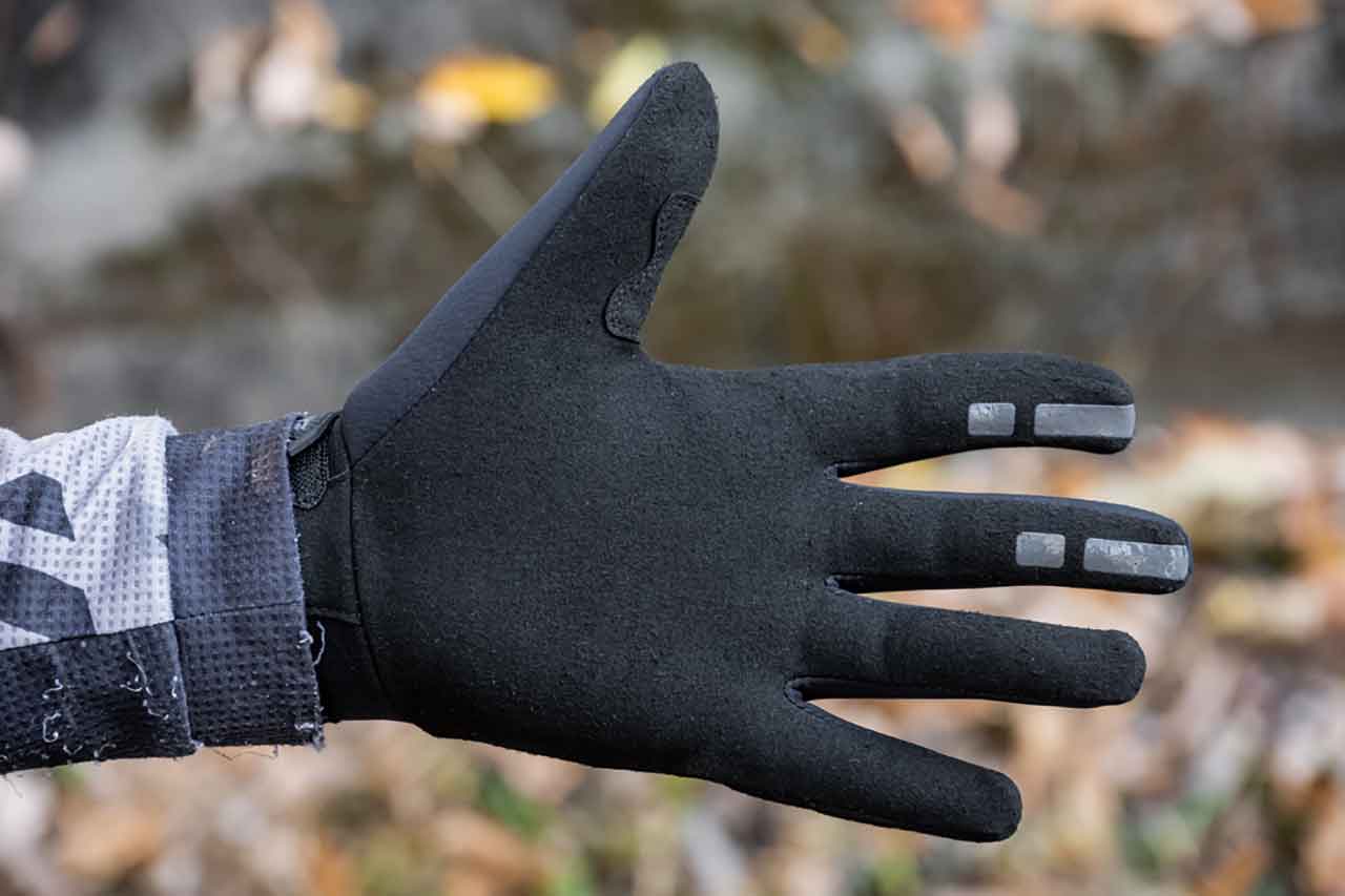 手のひらは一枚革構造で、グリップからのダイレクト感を損なわない。指先にはシリコンプリントが施され、レバー操作時の滑りを防止し、確実なタッチを実現する。さらに甲部内側には起毛生地を使い、肌触りと保温性を向上させている。