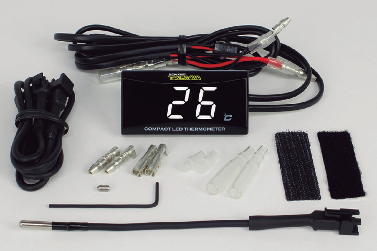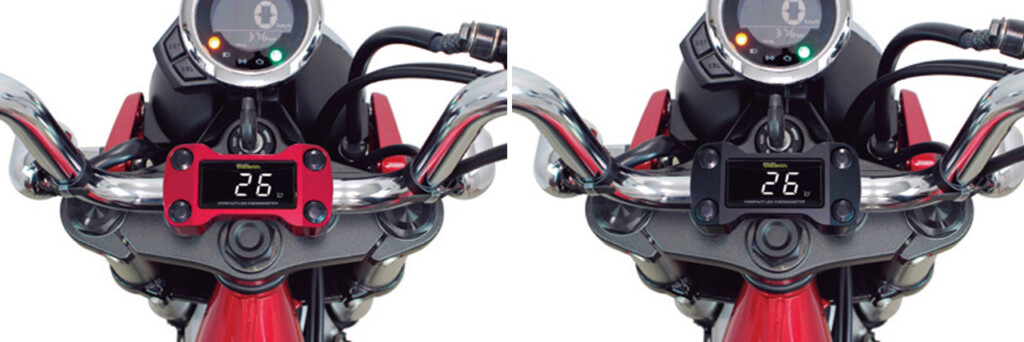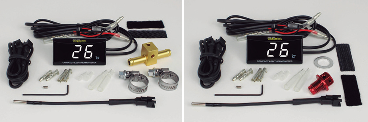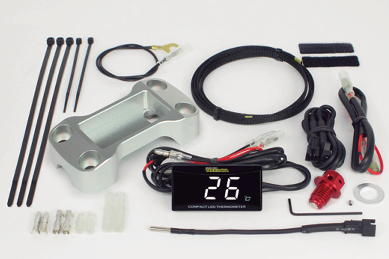 スリムデザインで軽量化を図りつつ、マジックテープでの貼り付けが可能なデジタル温度計にハンドルクランプが付属されたキット。温度計は0 ~ 120℃まで表示し、キットには配線加工の必要がないサブハーネスやドレンボルトが同梱されているのでお手軽装着が可能(ドレンボルトに接続しない場合は外気温時計としても使用できます)