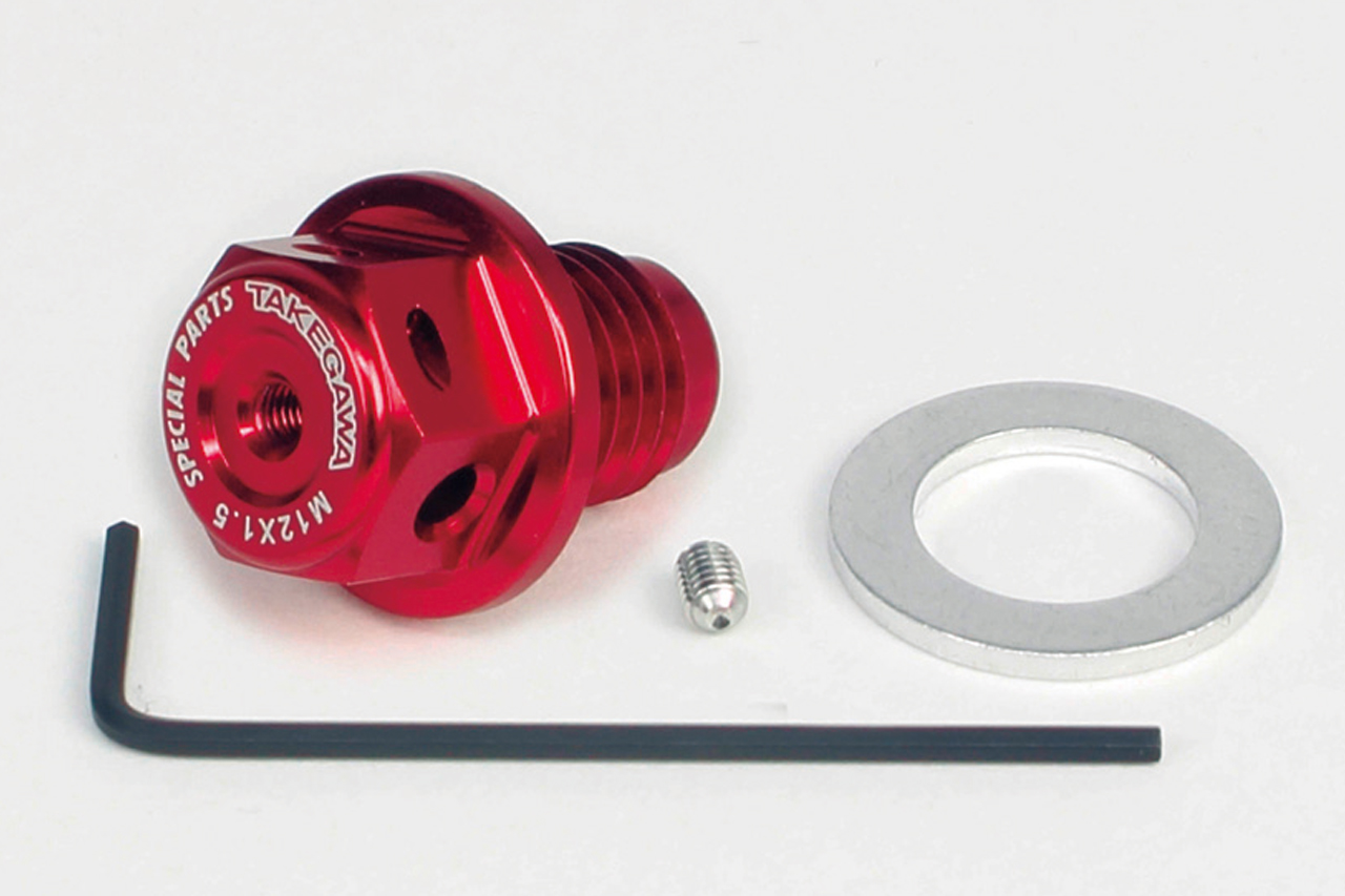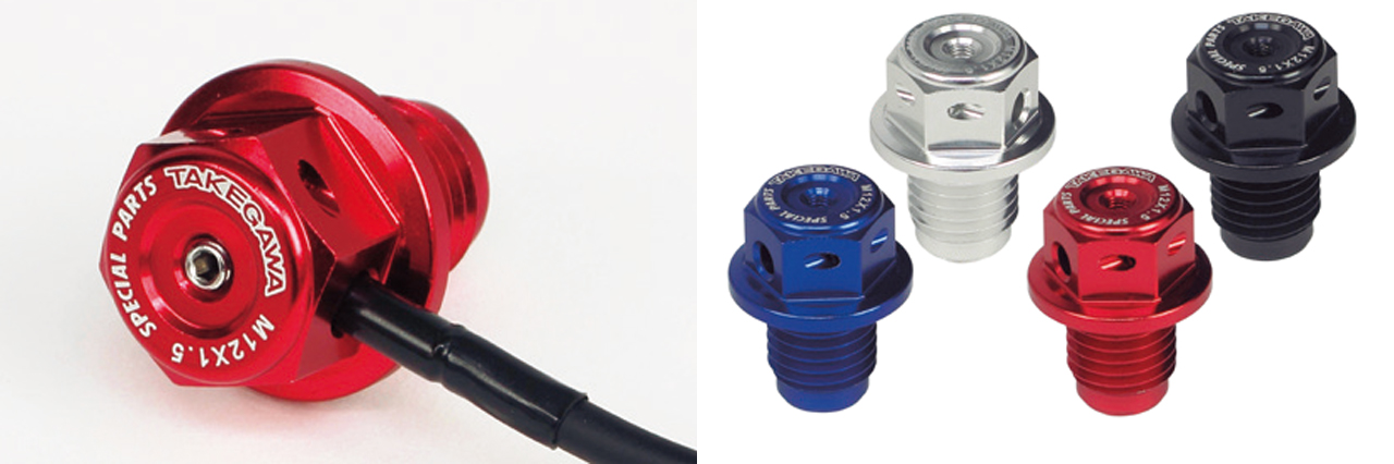 エンジンオイルに混ざった鉄粉をネオジム磁石の強力な磁力で吸着します。エンジンオイルの安定した潤滑性能をサポートするだけでなく、SP武川製スティック温度センサー用の差込穴が備わっているのがポイント。脱落防止用のワイヤーロック穴も備わっています